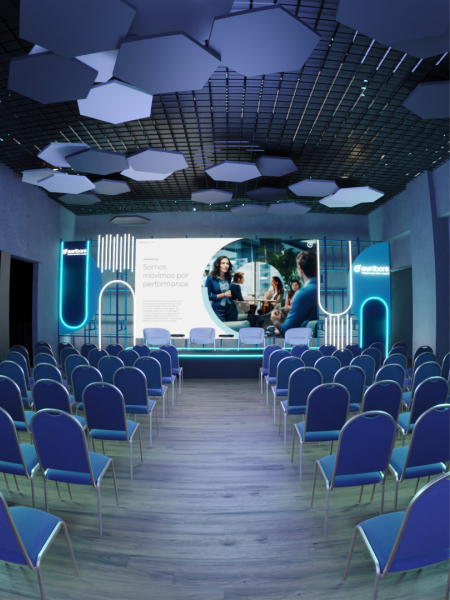 Desenvolvemos um ambiente envolvente para a Convenção Ouribank, refletindo a visão inovadora do banco com design moderno e tecnologia interativa.